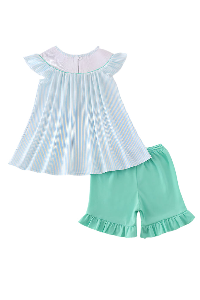 Add a touch of beachy fun to your little girl's wardrobe with our Blue Stripe Starfish Embroidery Smocked Girl Set. This playful set features a charming blue stripe design with embroidered starfish accents. Perfect for a day at the beach or a casual summer outing. (No seashells were harmed in the making of this outfit!)