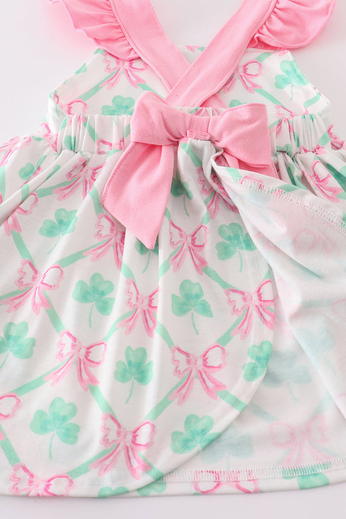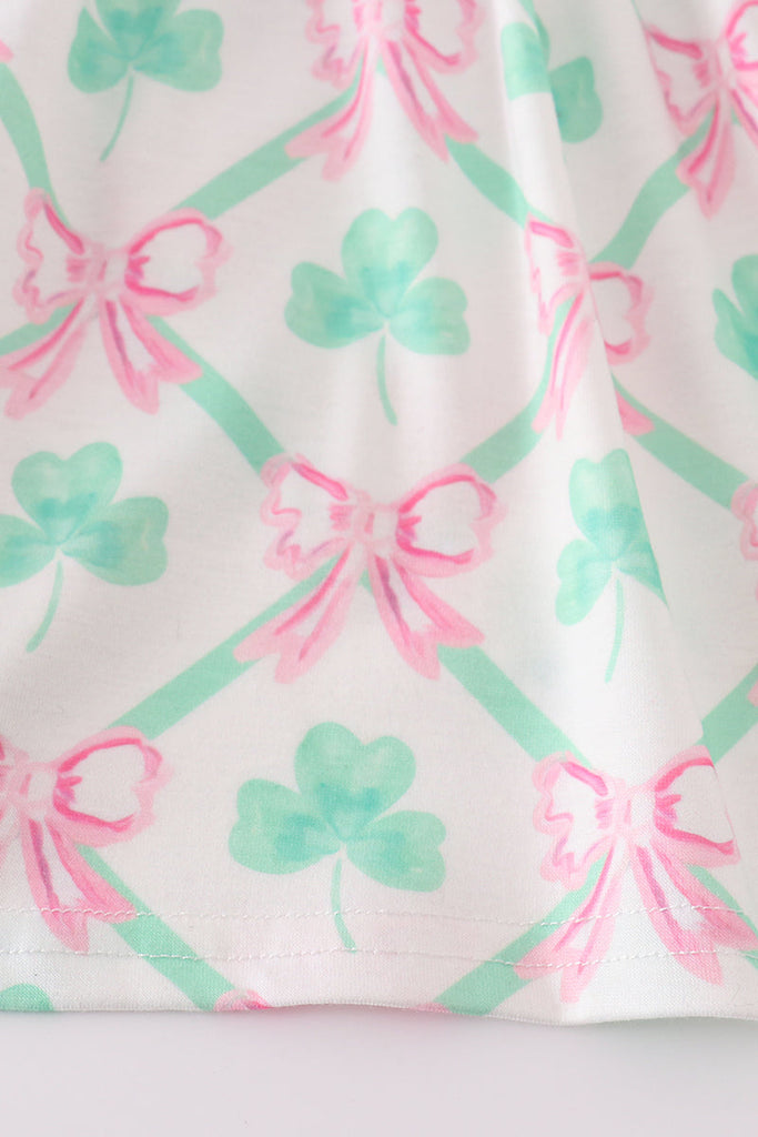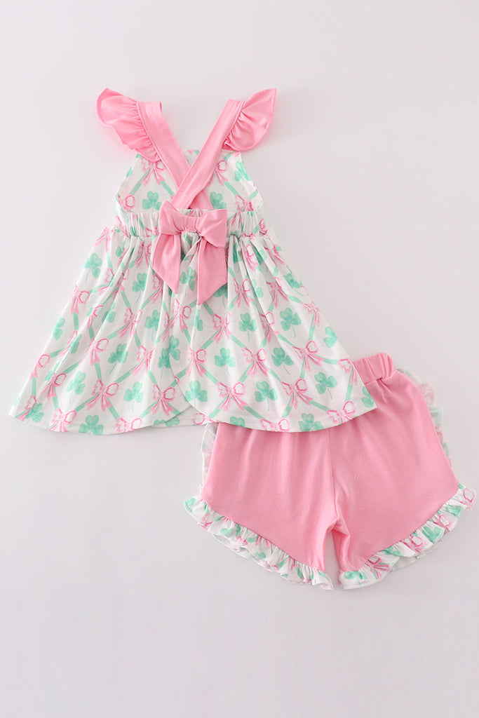 Get ready to shamrock with this playful St.Patrick's Day set for girls! Featuring a fun clover print and vibrant green color, this set is perfect for celebrating the holiday or adding a touch of luck to any day. Don't miss out on this one-of-a-kind set for your little leprechaun!