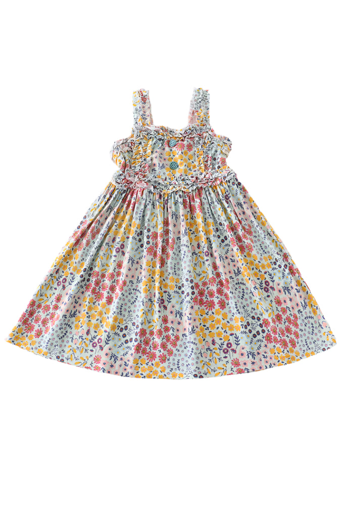 "Unleash your little one's playful side with our Platinum floral print strap dress! Made with high-quality materials, this dress features a stunning floral print that will make her shine. Perfect for any occasion, she'll feel confident and stylish while wearing this dress. Get ready to turn heads and receive compliments!"
